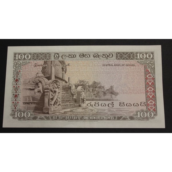 Billete de Sri Lanka año 1977 Central bank Of Ceylon de valor 100 rupees Banknote del Armas Ceylon. Clasificacion pick#81a conservacion (Sin Circular) Sin doblez central, Marca Clip en margen Superior.