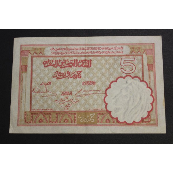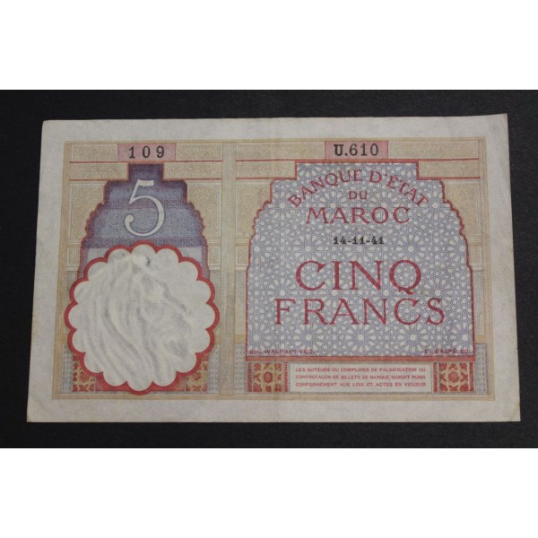 Billete de Marruecos año 1941 de valor 5 Francs. Banknote Banque D´Estat Maroc. clasificacion PICK#23AB. conservacion MBC+ Apresto. Leves puntos aguja.