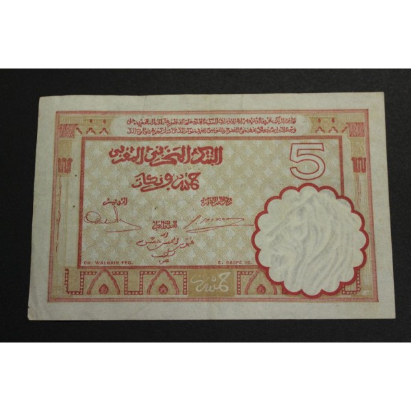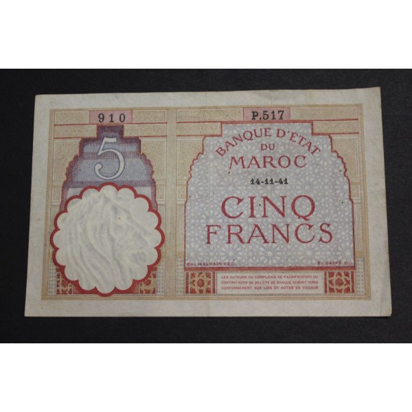 1941- MARRUECOS - 5 FRANCS - MAROC - BILLETE
