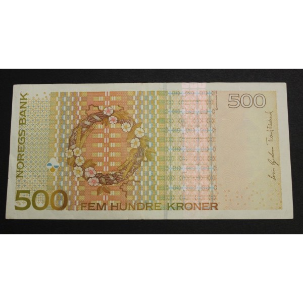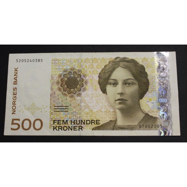 Billete de Noruega Norway año 2005 de valor 500 Kroner Birkeland. Banknote Sigrid Undste. Norges Bank Wold Papel Money. clasificacion PICK-51d. conservacion MBC.