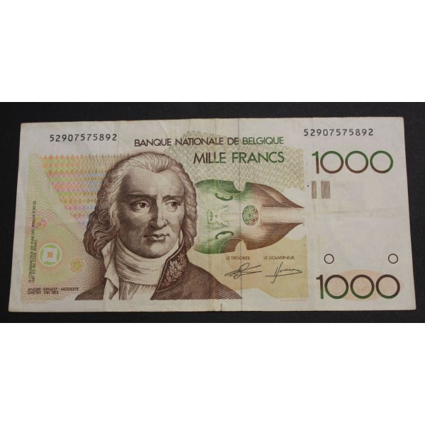 Billete de Belgica Banque Nationale Belgique No fecha ( 1980 - 1996 ) de valor 1000 Francs. Banknote Andre Ernest Modeste Gretry 1741-1813. Clasificacion Pick# 144a(7) calidad (MBC ) leve rotura en margen inferior.