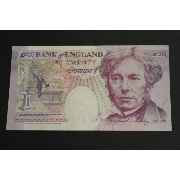 Billete del Reino Unido Gran bretaña. Bank Of England - Inglaterra de valor 20 Pounds.- 20 Libras fecha ND. (1991-1993 ) Billeter de la reina Elizabeth II Banknote Michael Faraday. clasificacion pick#384c. Wold Papel Money . conservacion MBC+. Apresto.