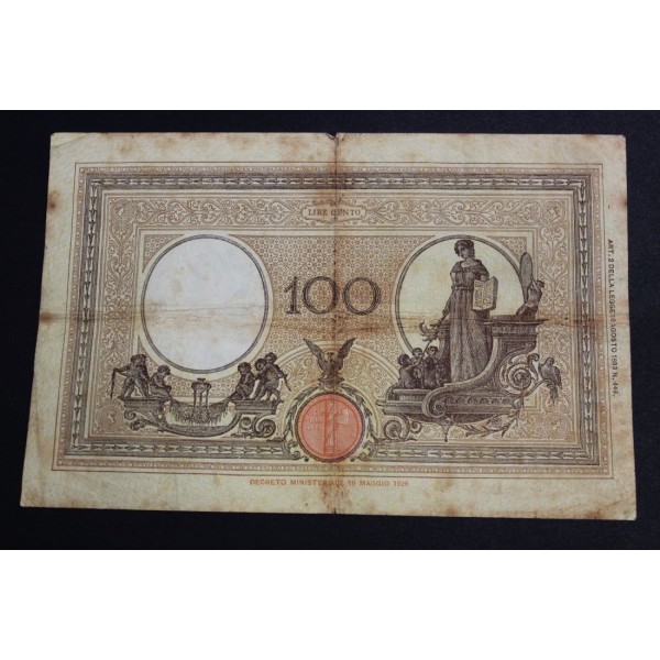 Billete de Italia fecha 18 - 11 - 1926 Banca D´ Italia. de valor 100 Lire cento Lire. Billete Alegorias. clasificacion PICK#50a .- conservacion (MBC). manchitas. leve rotura en pliege superior