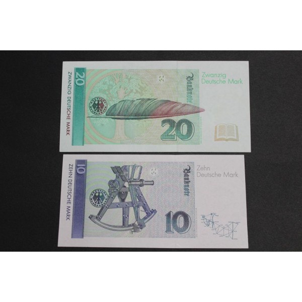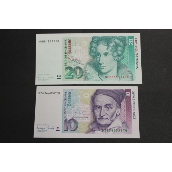 Lote de 2 Billetes de Alemania, 2 Banknote de Germany, de valores 10 mark - 20 Mark años 1993 - clasificacion Pick#38c - pick#39b conservacion (EBC).