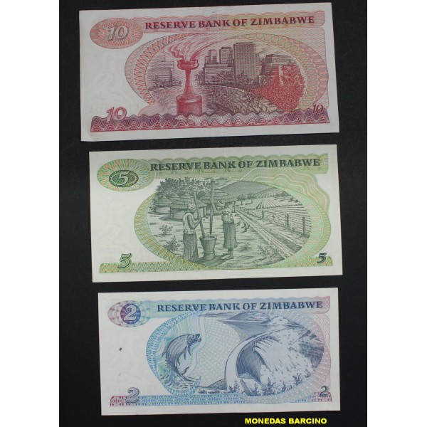 Lote de 3 Billetes de Zimbabue Banknote de la Reserve Bank of Zimbabwe años 1983 de valores 2 - 5 - 10 Dollars. clasificacion Pick#1 - 2 - 3. Wold papel Money. conservacion EBC/EBC+.