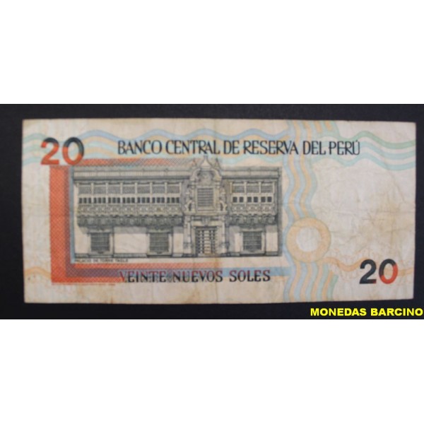 Billete de Peru Banc Central de Reserva de Peru fecha 1996 de de valor 20 nuevos Soles. Billete de Raul Porras Barrenechea. Banknote clasificacion Pick#164 conservacion (MBC).