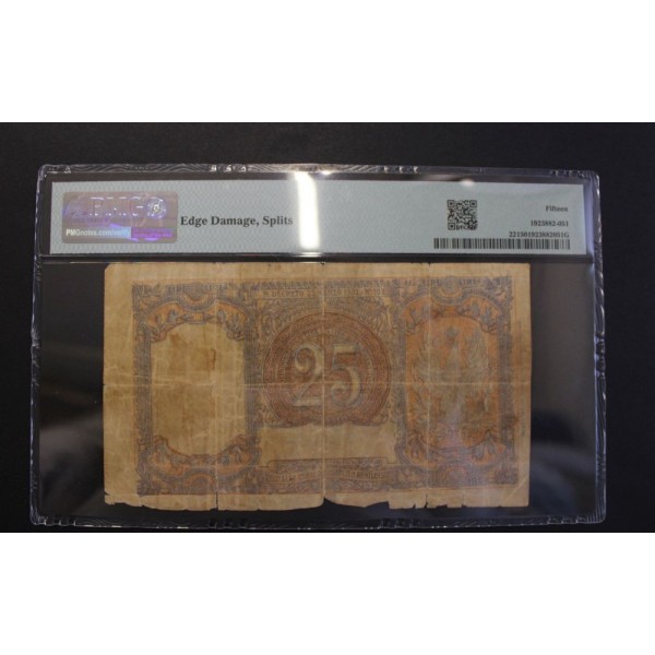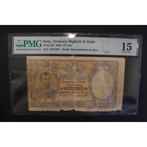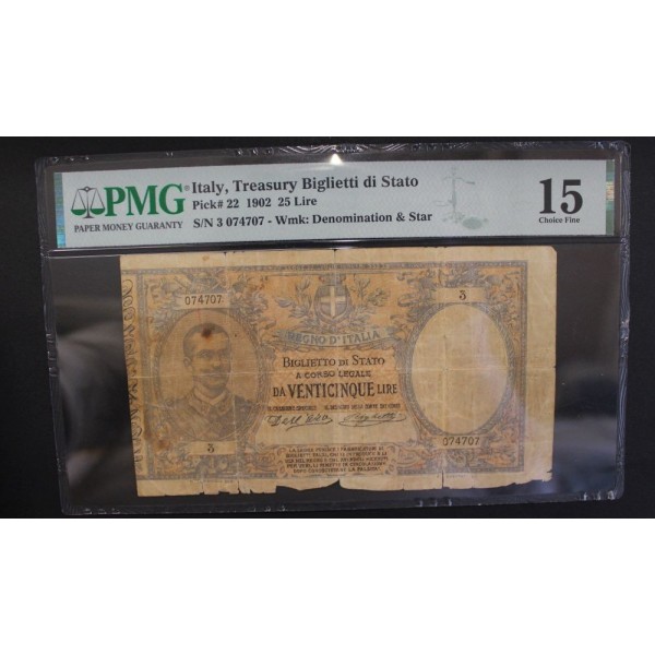 Billete del Regno de Italia fecha 23 de marzo de 1902 Nº 102 Italy, Treasury Biglietti di Stato a corso Legale de valor 25 lire. Billete Encapsulado PMG. 15- Choice Fine. Edge Damage, Splits. clasificacion PICK#22.