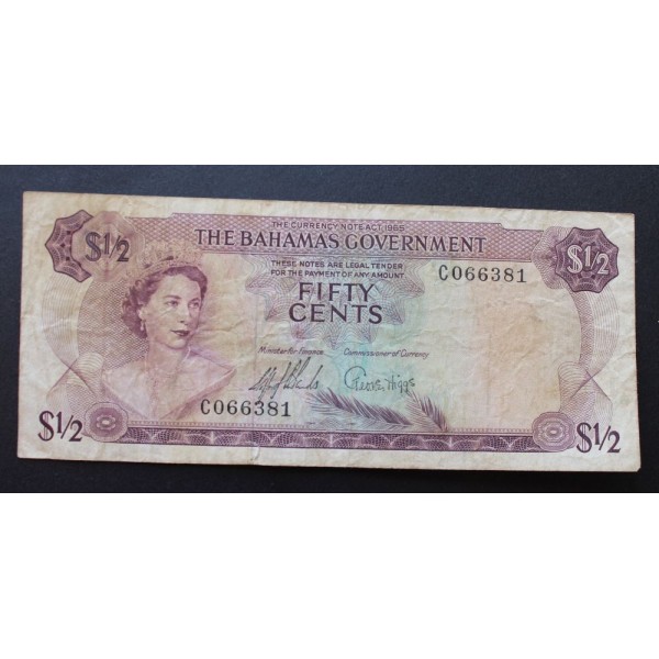 Billete de Bahamas The Bahamas Government fecha 1965 de valor 50 Fifty cents Billete de la Reina Elizabeth II Banknote clasificacion PICK#17a conservacion (MBC) World papel Money