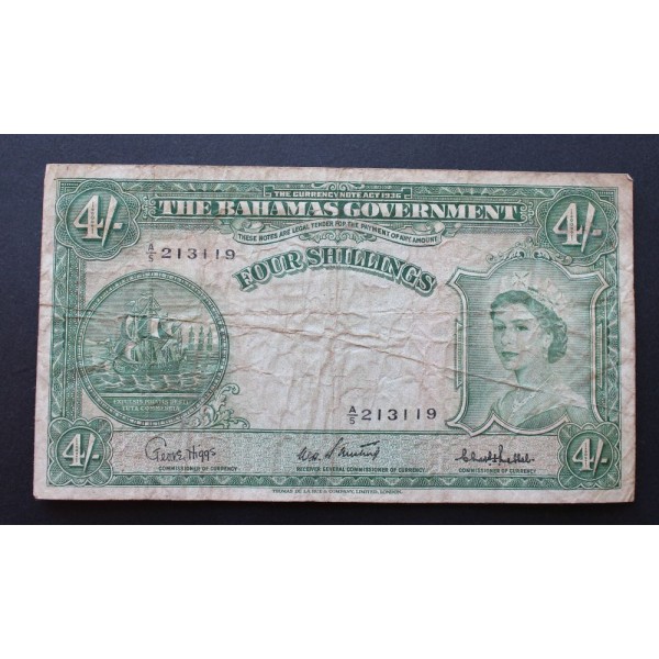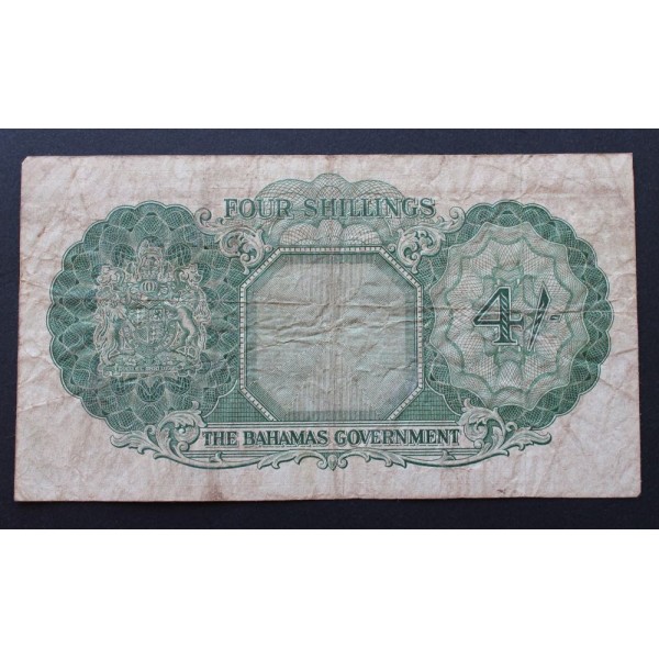 Billete de Bahamas The Bahamas Government fecha ( 1953 ) de valor 4 four Shillings Billete de la Reina Elizabeth II Banknote clasificacion PICK#13c. conservacion ( BC +) World papel Money