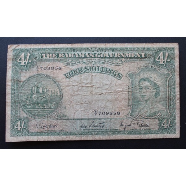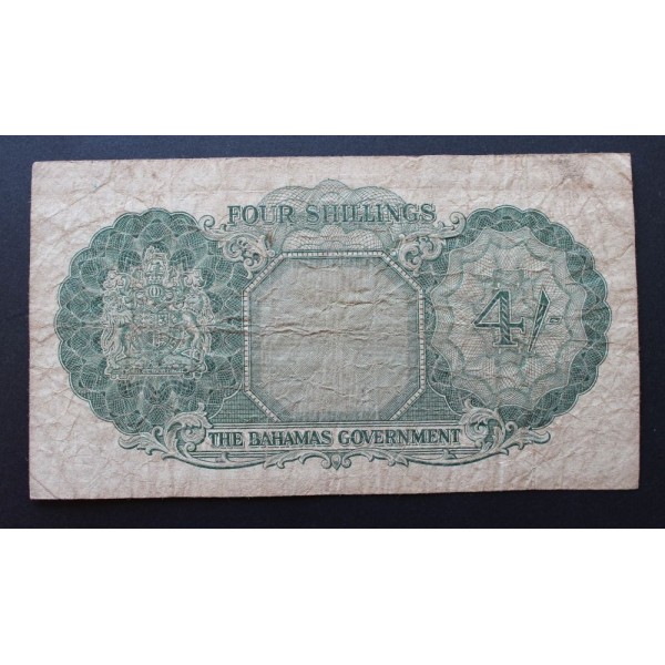 Billete de Bahamas The Bahamas Government fecha ( 1953 ) de valor 4 four Shillings Billete de la Reina Elizabeth II Banknote clasificacion PICK#13d. conservacion ( BC ) World papel Money