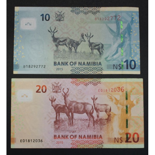 Lote de 2 Billetes de Namibia pais Africa fechas 1993 - 1999 de valores 10 dollars - 20 dollars. 2 Banknotes H.E. Dr. Sam Nujoma. Bank of Namibia clasifcicacion pick# 16 - 17- conservacion EBC
