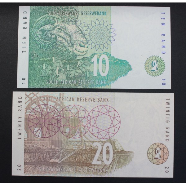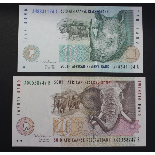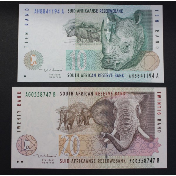 Billete de SudAfrica. South African Reserve Bank sin fecha ( 2005 ) de valor 10 Rand y 20 rand 2 Banknotes del Rinoceronte y Elefante de Africa. clasificacion Pick#128a.-129a conservacion Sin Circular