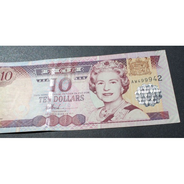 Billete de las Islas Fiji de valor 10 Dollars fecha (2002) Kikau- Banknote de la Reina Elizabeth II. Reserve Bank of Fiji Wold papel Money clasificacion PICK#106a. conservacion EBC
