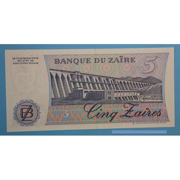 Billete de Zaire del Banque du Zaire fecha 24 de noviembre de 1985 de valor 5 Zaires Billete Hotel des Monnaies. clasificacion PICK#26A conservacion sin circular.