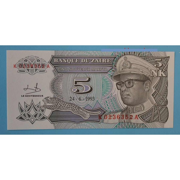 Billete de Zaire del Banque du Zaire fecha 24- 6 - de 1993 de valor 5 Nuevos Makuta Billete . clasificacion PICK#48 conservacion sin circular.