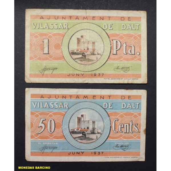 lote de 2 Billetes de Barcelona del Ayuntament de Vilassar de Dalt fecha Juny de 1937 de valores 1 pesseta y 50 centims . Billete Guerra civil Española. Papel Moneda local. conservacion MBC / MBC- manchitas.