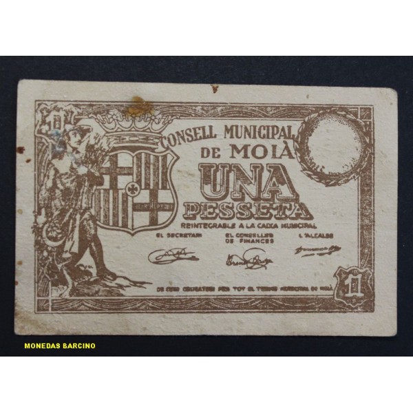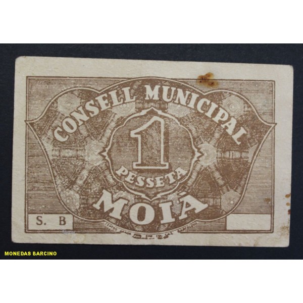 Billete de Barcelona Consell Municipal de Moia de valor 1 pesseta fecha emision de 1937. Sello en Tinta. Billete de la Guerra civil Española. Papel Moneda local Catalan. conservacion (EBC) manchitas, Sin doblez