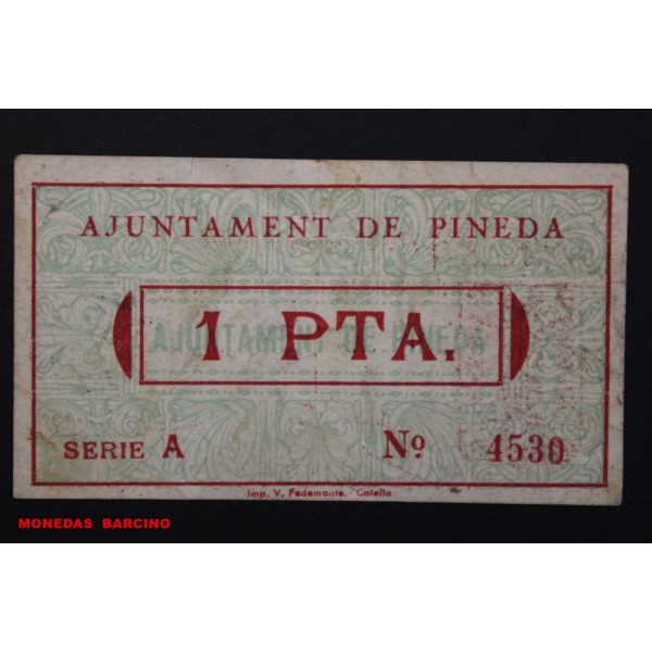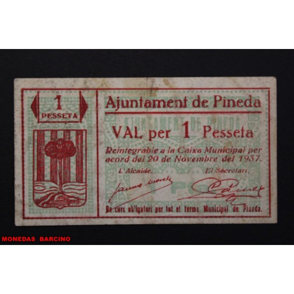 Billete de Barcelona Ajuntament de Pineda de valor 1 pesseta fecha Pineda 20 de Novembre del 1937. Billete de la Guerra civil Española. Papel Moneda local Catalan. conservacion ( MBC )