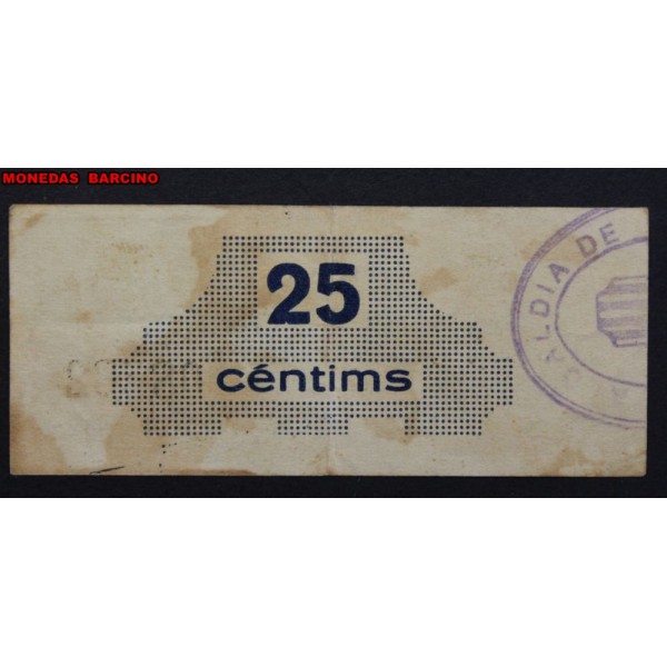 Billete de la Provinvia de Tarragona Ajuntament de Amposta . fecha emison Maig del 1937 de valor 25 centims. Sello en tinta. Billete de la Guerra civil Española. Papel Moneda local Catalan. conservacion MBC
