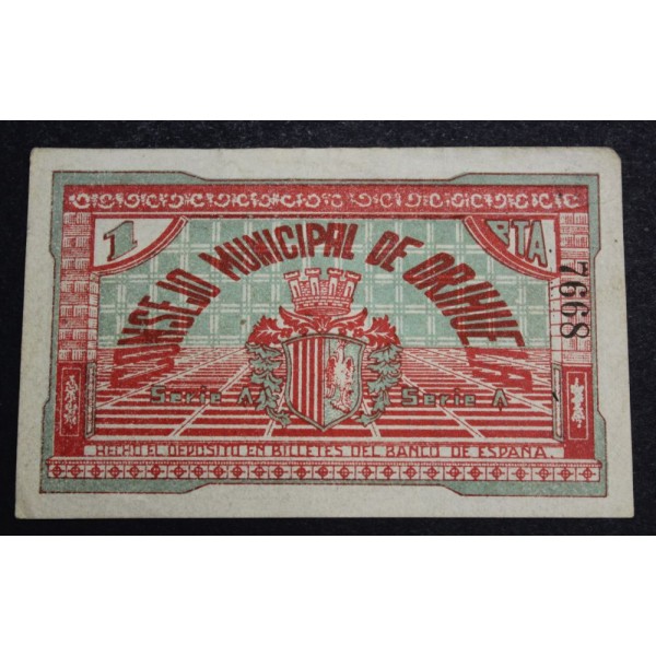 Billete de Alicante El Consejo Municipal de Orihuela de valor 1 pessetas fecha 13 de mayo de 1937 - Billete de la Guerra civil Española. Papel Moneda. conservacion MBC+. Sin Doblez Central