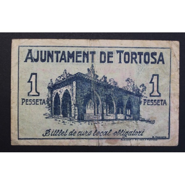 Billete de la Provinvia de Tarragona Ajuntament de Tortosa . fecha emison 9 novembre del 1937 de valor 1 Pesseta. Billete de la Guerra civil Española. Papel Moneda local Catalan. conservacion (BC)