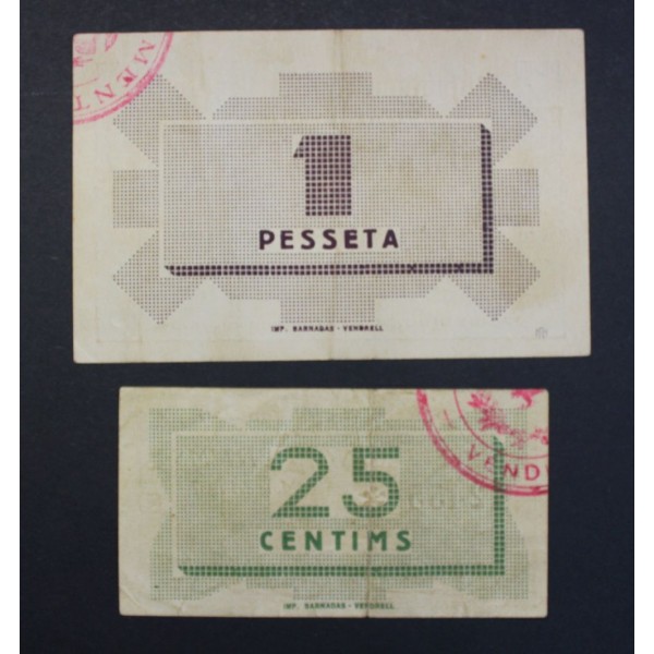 Lote de 2 Billetes de la Provinvia de Tarragona Ajuntament de El Vendrell . fecha emison Maig del 1937 de valor 25 centims 1 Pesseta. Sello en Tinta. Billete de la Guerra civil Española. Papel Moneda local Catalan. conservacion MBC/MBC+