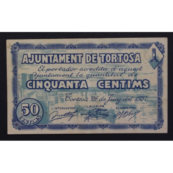 Billete de la Provinvia de Tarragona Ajuntament de Tortosa . fecha emison 26 de Juny del 1937 de valor 50 centims. Billete de la Guerra civil Española. Papel Moneda local Catalan. conservacion MBC+.