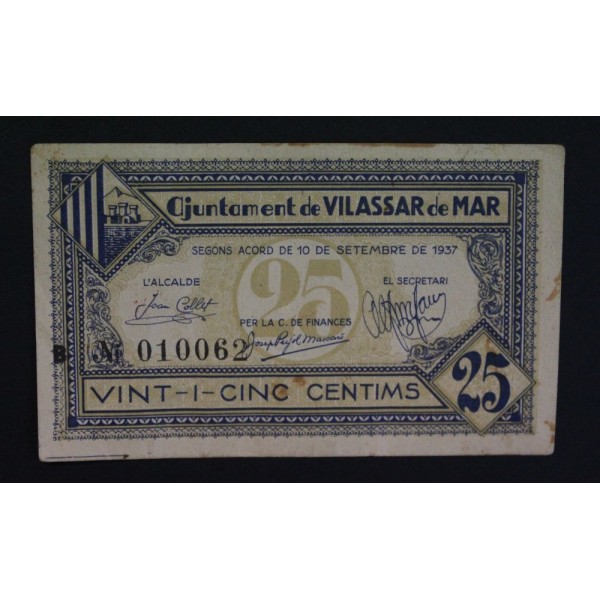 Billete de Barcelona del Ajuntament de Vilassar de Mar fecha emision 10 de setembre del 1937 de valor 25 Centims. .Billete con Sello con Tinta. Billete Guerra civil Española. Papel Moneda local. conservacion MBC+