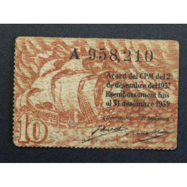 Billete de la Provincia de Barcelona Ajuntamnet de Barcelona de valor 10 Centims fecha emision del 1937. Billete de la Guerra civil Española. Papel Moneda local Catalan. conservacion MBC