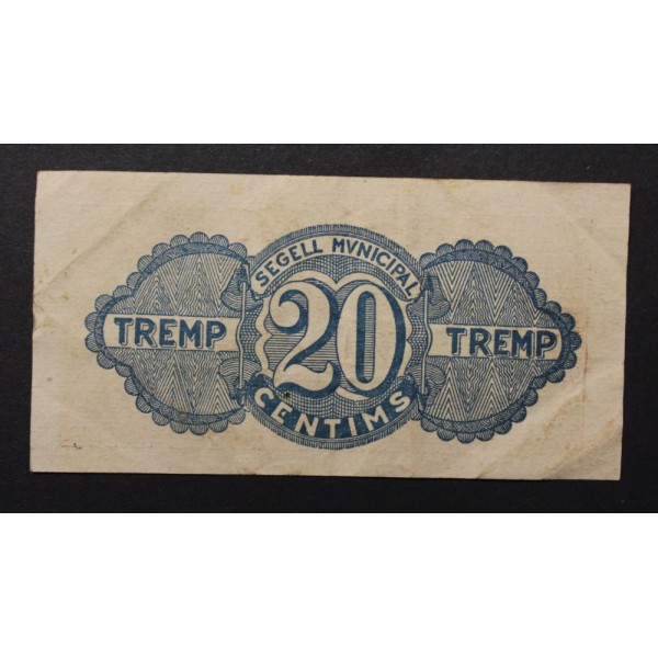 Billete de la Provincia de Lleida Consell Municipal de Tremp fecha emision del (1937) Lerida de valor 20 Centims. Billete Guerra civil Española. Papel Moneda local Catalan. conservacion (MBC)