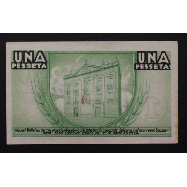 Billete de la Provincia de Lleida Ajuntament de Solsona fecha emision 1 de diciembre del 1937 Lerida de valor 1 pesseta. Billete Guerra civil Española. Papel Moneda local Catalan. conservacion EBC