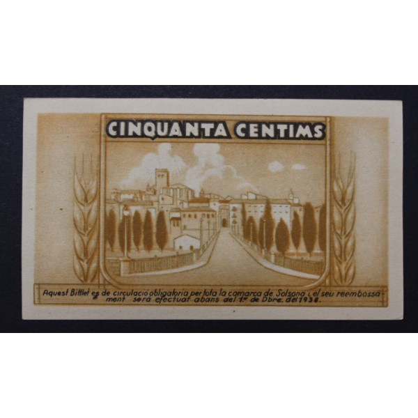 Billete de la Provincia de Lleida Ajuntament de Solsona fecha emision 1 de diciembre del 1937 Lerida de valor 50 centims. Billete Guerra civil Española. Papel Moneda local Catalan. conservacion ( Sin Circular) Sin doblez Central.