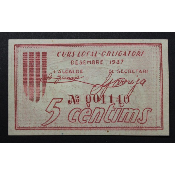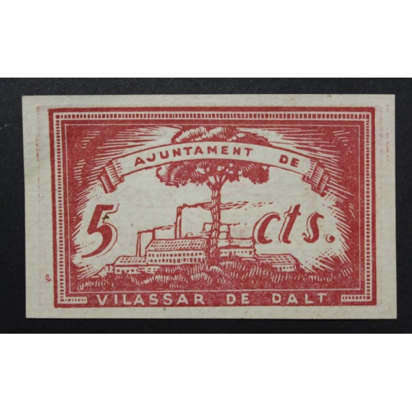 Billete de la Provincia de Barcelona Ajuntamnet de Vilassar de Dalt de valor 5 Centims fecha emision Desembre del 1937. Billete de la Guerra civil Española. Papel Moneda local Catalan. conservacion EBC+ Sin doblez Central.