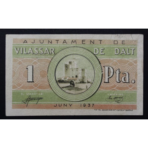 Billete de la Provincia de Barcelona Ajuntamnet de Vilassar de Dalt de valor 1 Pesseta Centims fecha emision juny del 1937. Sello en Seco. Billete de la Guerra civil Española. Papel Moneda local Catalan. conservacion (MBC). marca celo antiguo.