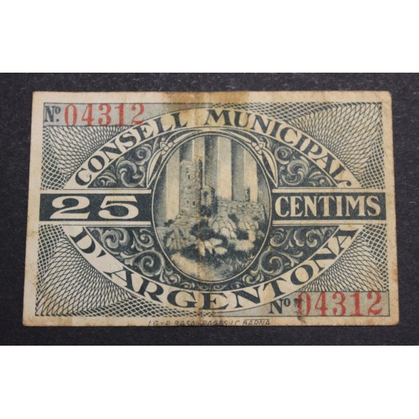 Billete de la Provincia de Barcelona Consell Municipal d´ Argentona de valor 25 centims. fecha emision 30 de setembre del 1937. Billetes de la Guerra civil Española. Papel Moneda local Catalan. conservacion (MBC) manchas