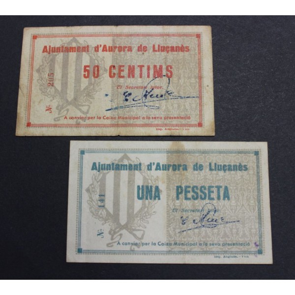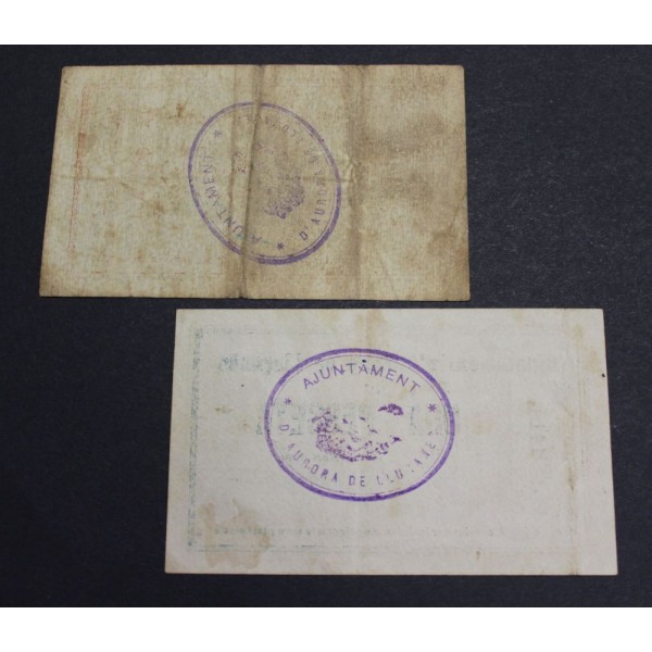 Lote de 2 Billetes de la Provincia de Barcelona Ajuntament d´ Aurora de Lluçanes de valores 50 centims y 1 pesseta fecha emision del 1937. Sello en tinta. Serie Completa. 2 Billetes de la Guerra civil Española. Papel Moneda local Catalan. conservacion MBC/MBC+