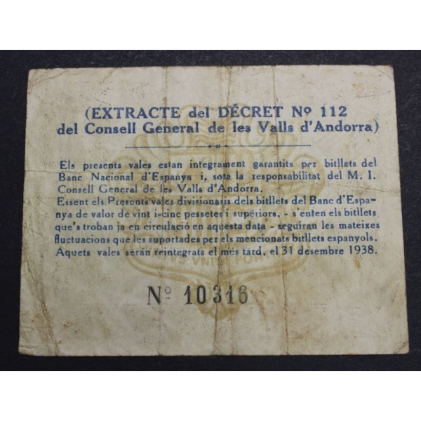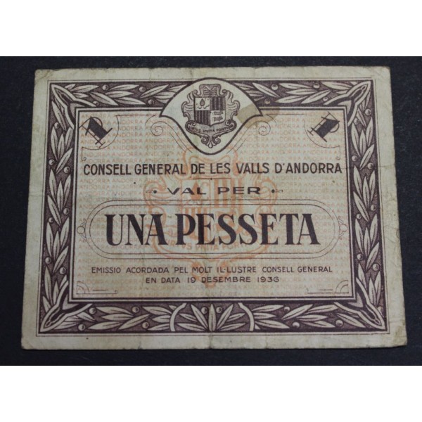 Billete de Andorra. Consell General de les Valls de Andorra fecha emision 19 desembre del 1936. de valor 1 pesseta. Billete de la Guerra civil Española. Papel Moneda local Catalan. conservacion (MBC).