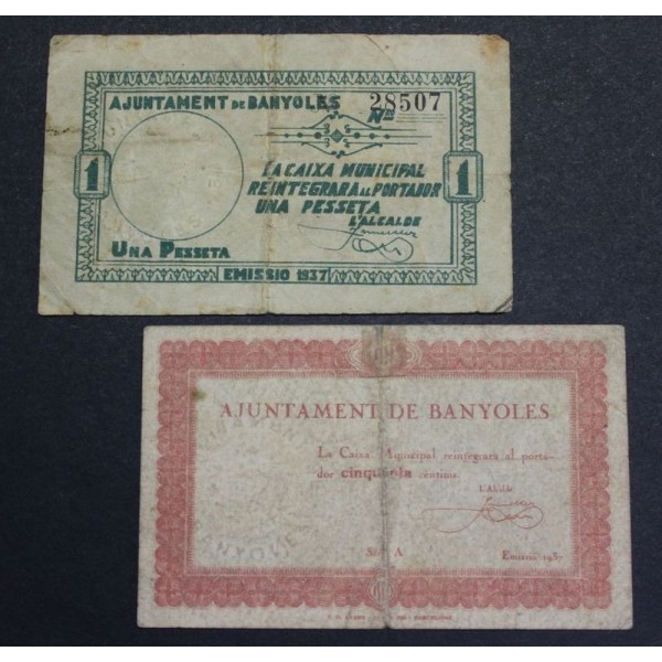 1937- BANYOLES - 2 BILLETES - GIRONA - 50 CENTIMS -1 PESETA