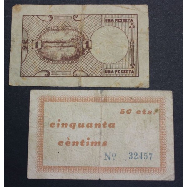 Lote de 2 Billetes de la Provindicia de Girona del Ajuntament de Banyoles valores 50 centims y 1 Pesseta. sello en Seco. fecha emision del 1937. 2 Billetes de la Guerra civil Española. Papel Moneda local Catalan. conservacion ( BC+ ) el Billete de 50 centims reparacion Antigua.