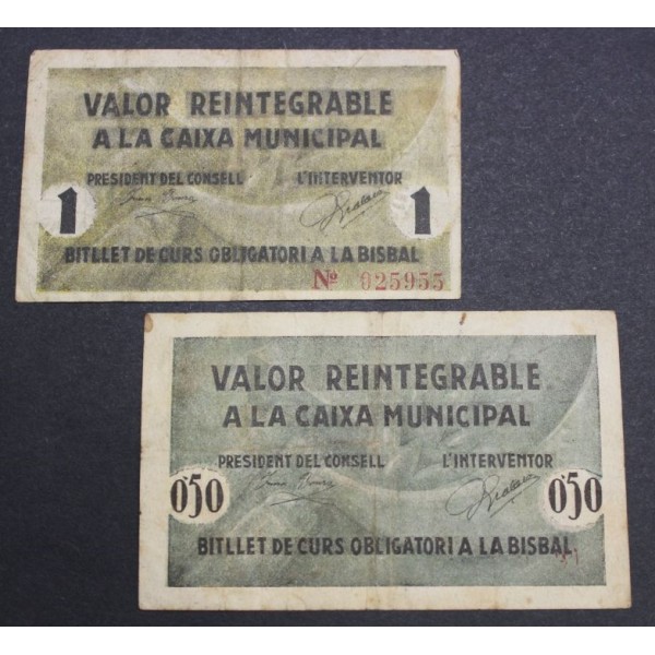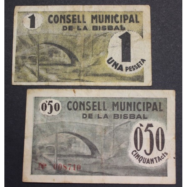 Lote de 2 Billetes de la Provindicia de Girona del Consell Municipal de La Bisbal de valores 50 centims. y 1 Pesseta. fecha emision del 1937. Sello en seco. Billete de la Guerra civil Española. Papel Moneda local Catalan. conservacion (MBC-)