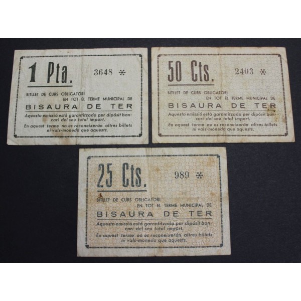 Serie Completa de 3 Billetes de la Provincia de Girona Ajuntament de Bisaura de Ter. de valores 25 centims. 50 centims. 1 pesseta fecha emision 22 maig del 1937 Gerona. Sello en seco. 3 Billetes de la Guerra civil Española. Papel Moneda local Catalan. conservacion MBC+ sucio.