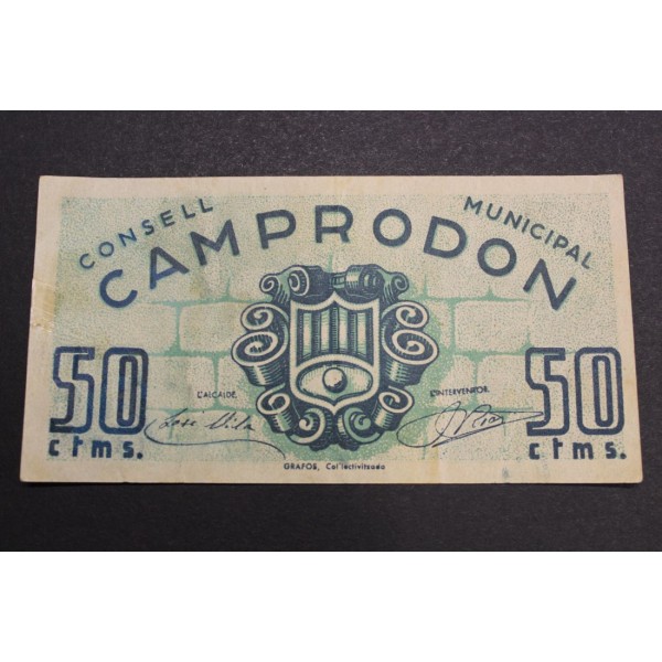 Billete de la Provincia de Girona Consell Municipal de Camprodon. de valor 50 centims fecha emision del 1937 Gerona. Sello en seco. Billete de la Guerra civil Española. Papel Moneda local Catalan. conservacion MBC+ restos de celo antiguo.