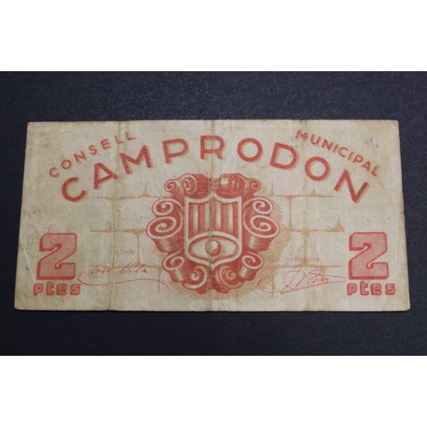 Billete de la Provincia de Girona Consell Municipal de Camprodon. de valor 2 Pessetas fecha emision del 1937 Gerona. Sello en seco. Billete de la Guerra civil Española. Papel Moneda local Catalan. conservacion (MBC)
