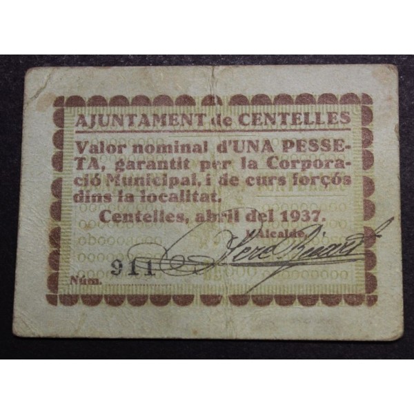 1937- CENTELLES - 1 PESETAS- BARCELONA