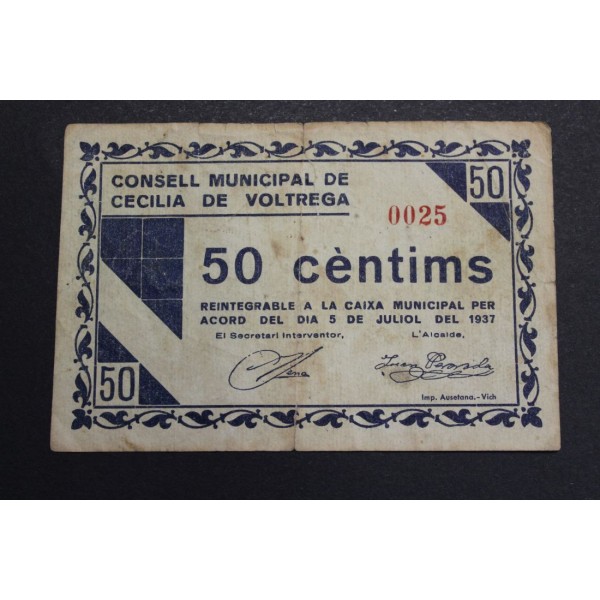 Billete de la Provincia de Barcelona del Cosell Municipal de Cecilia de Voltrega. de valor 50 centims fecha emision 5 julio del 1937. Sello en tinta. Numeracion Baja. Billete de la Guerra civil Española. Papel Moneda local Catalan. conservacion (MBC) reparacion Antigua.