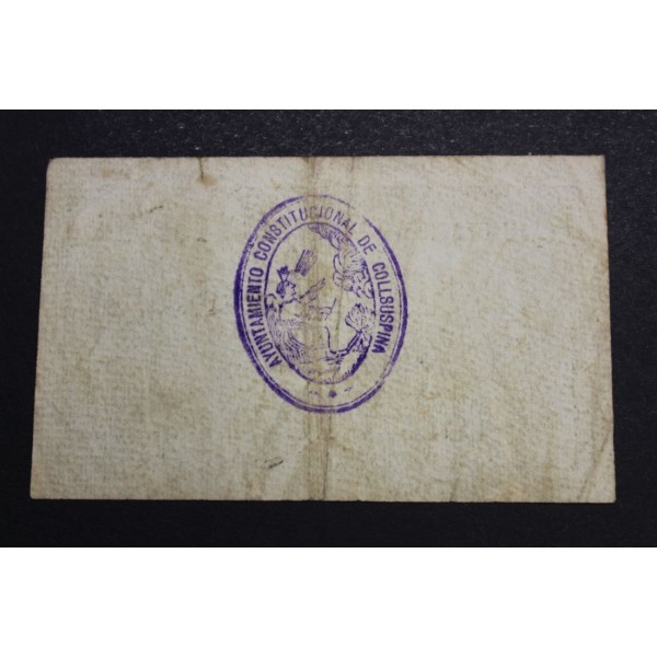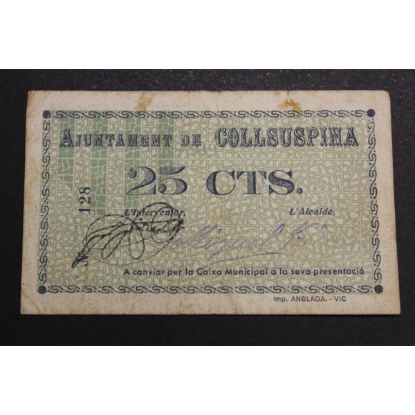 Billete de la Provincia de Barcelona del Ajuntament de Collsuspina. de valor 25 centims fecha emision del 1937. Sello en tinta. Billete de la Guerra civil Española. Papel Moneda local Catalan. conservacion ( MBC )