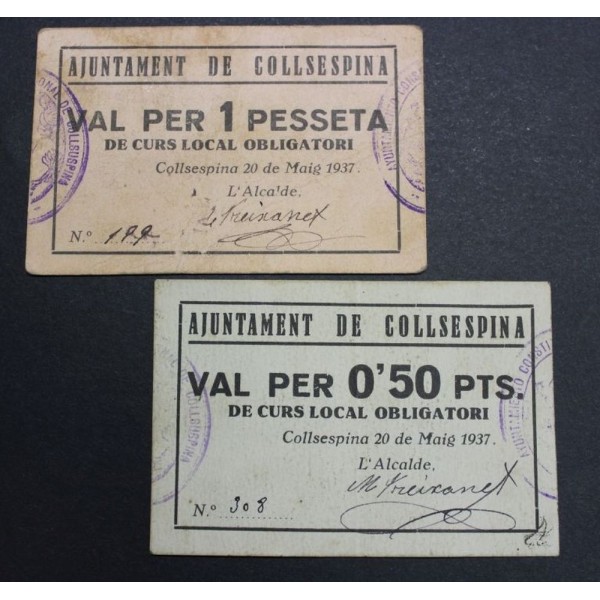 Serie completa de 2 Billetes de la Provincia de Barcelona del Ajuntament de Collsespina. de valores 50 centims y 1 pesseta. fecha emision 20 maig del 1937. Sello en tinta . serie completa. 2 Billetes de la Guerra civil Española. Papel Moneda local Catalan. conservacion ( MBC )