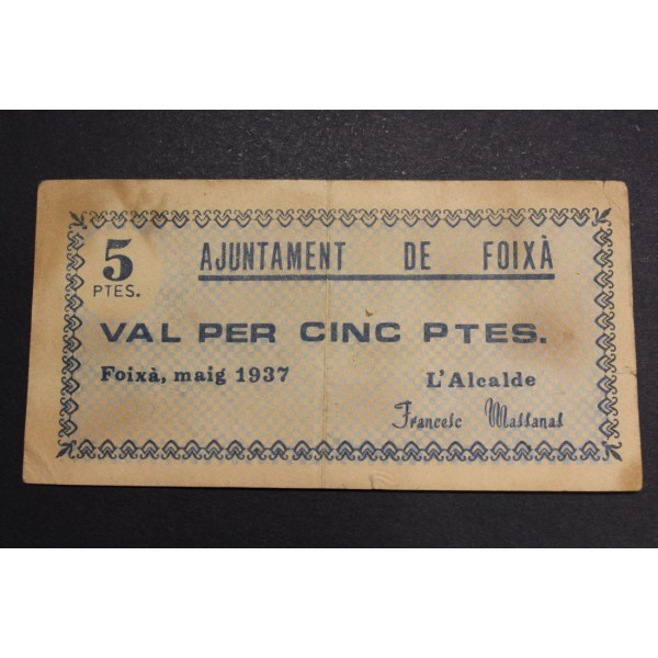 Billete de la Provincia de Girona Ajuntament de Foixa de valor 5 pessetes. fecha emision maig del 1937 Gerona. Billete de la Guerra civil Española. Papel Moneda local Catalan. Conservacion ( MBC+ ) manchas.