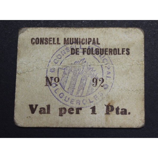 Billete de la Provincia de Barcelona del Consell Municipal de Folgueroles de valor 1 Pesseta. fecha emision del 1937. Sello en tinta . Numeracion Baja. Billete de la Guerra civil Española. Papel Moneda local Catalan. Conservacion (MBC)