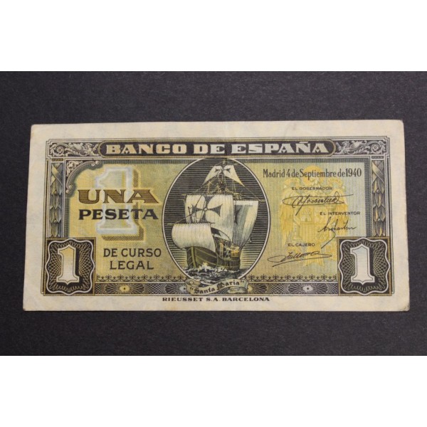 Billete de Banco de España fecha 4 de septiembre de Madrid 1940 de valor 1 peseta Billete Serie I. Billete del Barco SANTA MARIA. clasificacion PICK#122a. Banknote Estado Español conservacion MBC